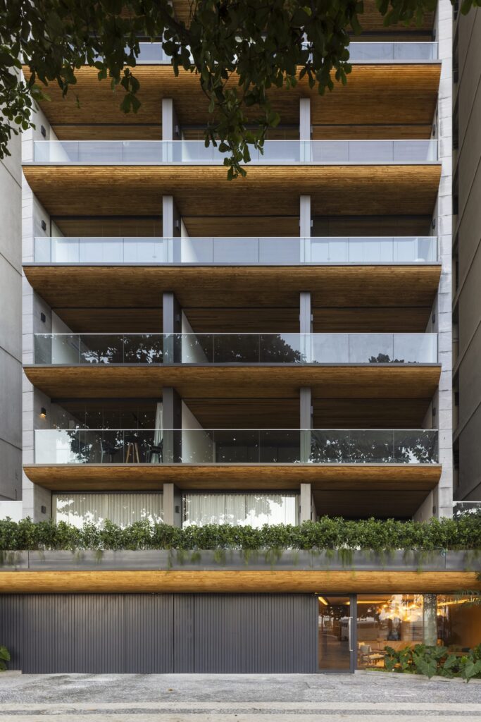 Malha de tabeiras de accoya em diferentes planos e sentidos e brises da cobertura
